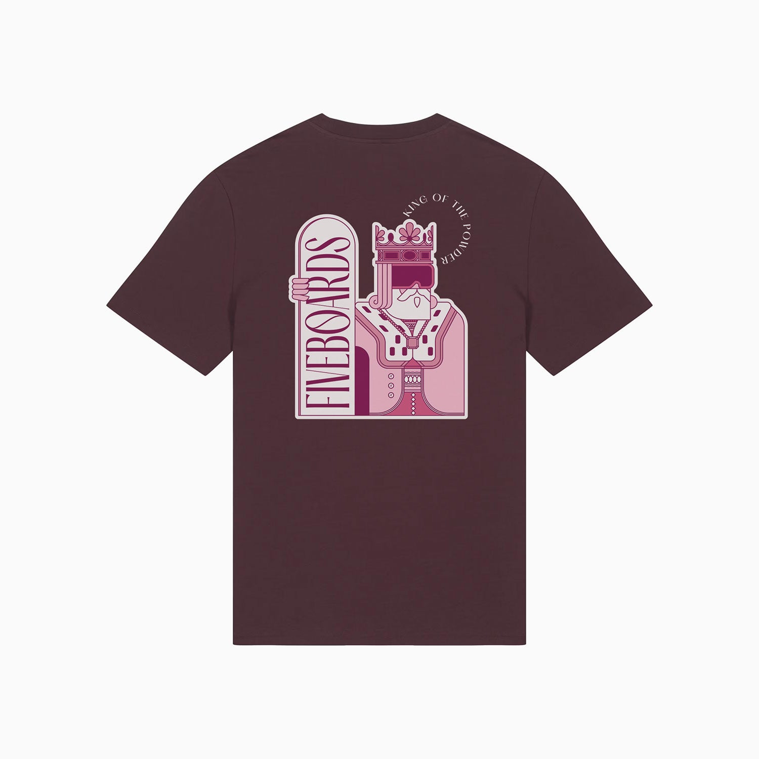 Das King of the Powder Design vereint Snowboard-Kultur mit ikonischer Illustration: Ein stilisierter König hält selbstbewusst sein Board – ein Symbol für Kontrolle, Flow und Respekt vor dem Powder. Die warme Bordeaux-Grundfarbe trifft auf kontrastreiche Rosé- und Creme-Töne und macht das Shirt zum Blickfang, egal ob im Resort, im Park oder im Alltag.